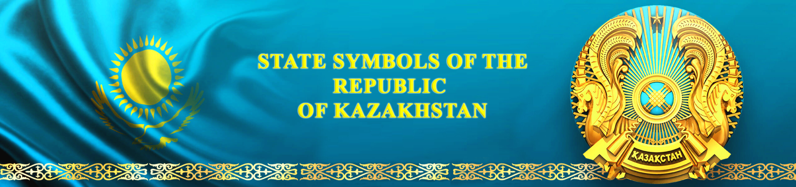 The State Flag of the Republic of Kazakhstan is a rectangular breadth of blue colour with the image of the sun in its center with a soaring steppe eagle underneath. Along the flagstaff there is a vertical band with the national ornamental patterns. The images of the sun, rays, eagle and ornament are of golden colour. The ratio of the Flag’s width to its length: 1:2.